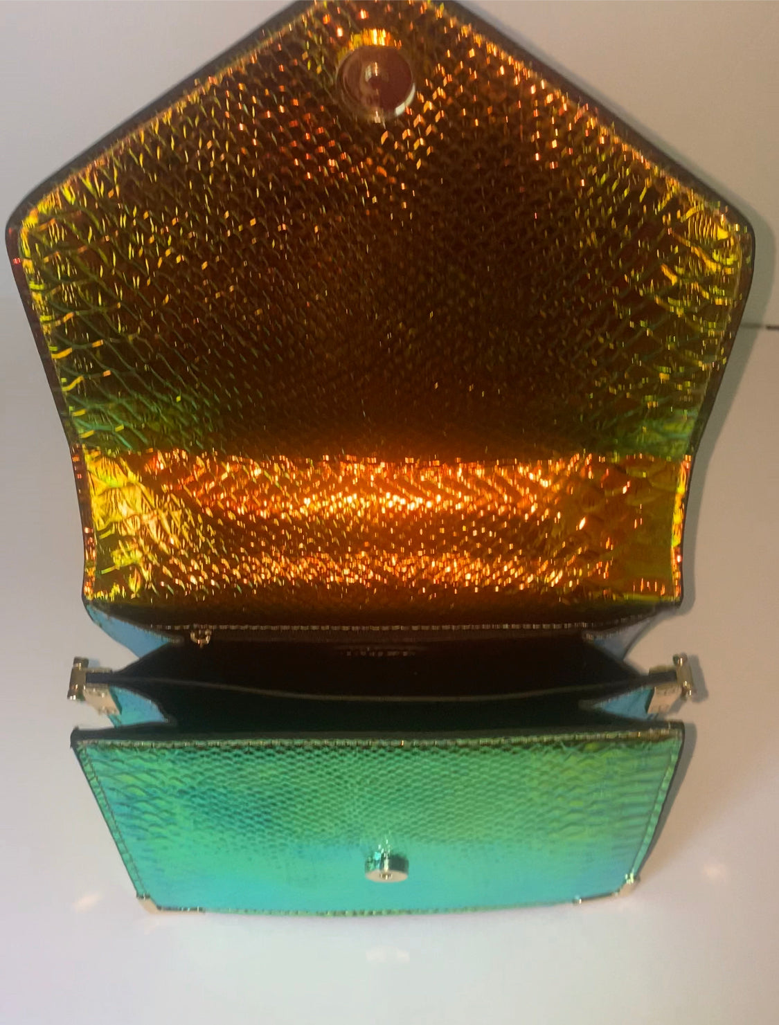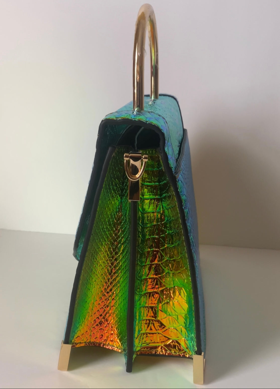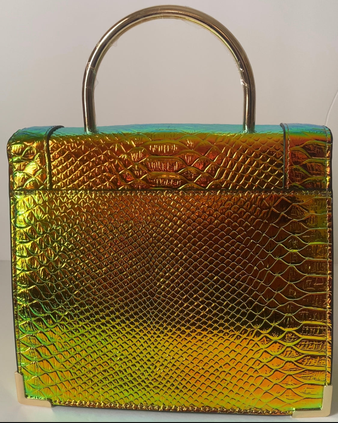 The bougie bag is designed to be a glamorous and functional everyday handbag for the woman who wants to make a statement. When you want to carry bougie and turn heads at the same time, only the bougie bag will do. This beautiful snakeskin leather purse has a removable strap so you can convert it into a crossbody or top handle bag. You can pair this bag with almost everything the reflective gold shows multi color way depending on which way the bag is held.